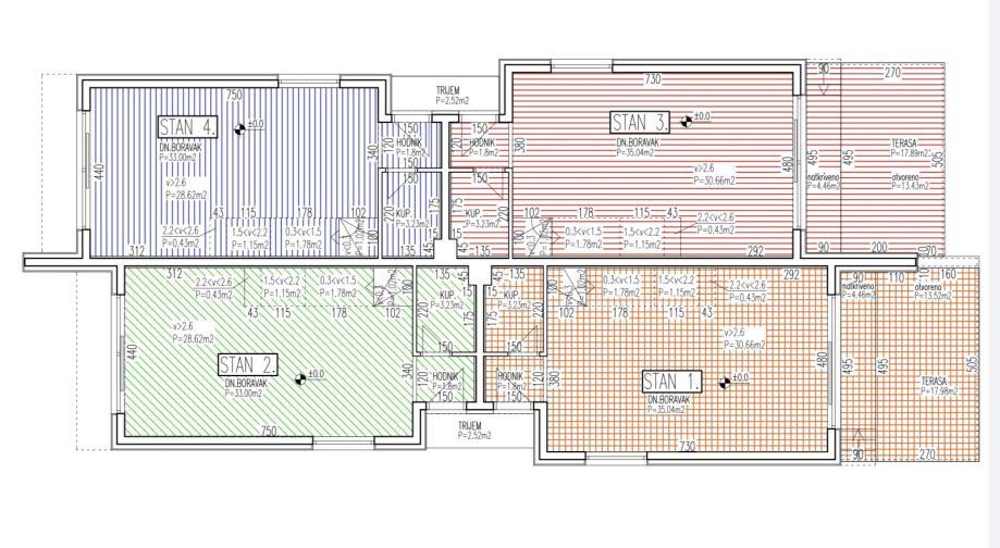 Prodaju se potpuno opremljeni i nekorišteni stanovi S1 (84,68 m2 + terasa 22,44 m2 + vrt 43,46 m2 + 2 parkirna mjesta 13,64 m2 i12,88 m2) i S2 (80,32 m2 + vrt 77,47 m2 + 1 parkirno mjesto 16,99 m2 ).